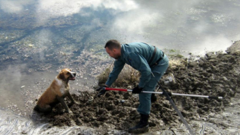 Hunden lå ubevægelig og helt udmattet i et mudret område, hvor den forgæves havde forsøgt at komme ud.