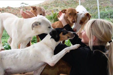 Heidi Boel og tre begejstrede spanske hunde (foto: Heidi Boel)