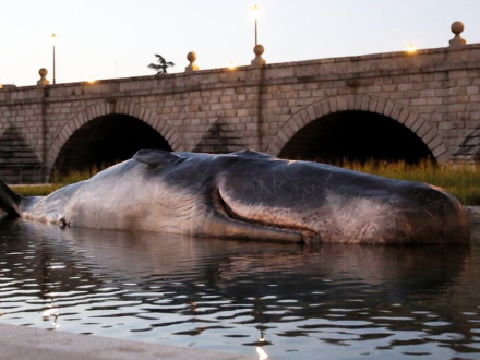VIDEO: Folk i hovedstaden fik sig noget af en overraskelse, da en strandet hval pludselig dukkede op på Manzanares-flodens bredder.
