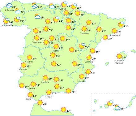 Maksimumtemperaturerne stiger på det meste af halvøen og Balearerne, undtagen langs Málagas vestkyst og i Gibraltarstrædet, hvor der forventes et fald. Vi taler generelt om ret høje temperaturer på over 36 til 38 grader i store dele af halvøens indre egne - især i Ebro- og Guadalquivir-dalene og på Balearerne.
