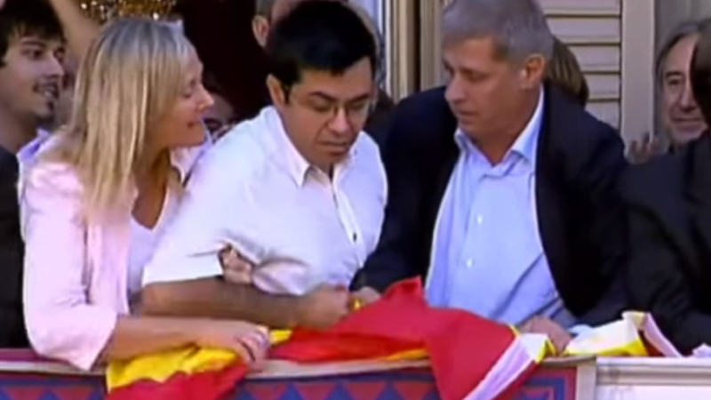 Det konservative Partido Popular er stærkt imod catalansk uafhængighed, og derfor ville PP-politikeren Alberto Fernández Díaz hænge det spanske flag udover balkonen, men det gik ikke helt så glat.