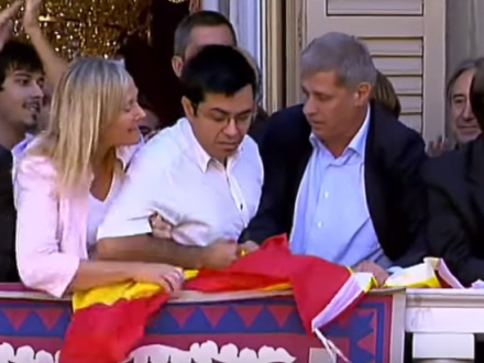 På balkonen udspillede det sig temmelig komisk. For lige så snart et par af uafhængigheds modstanderne havde fået øje på flaget, forsøgte de at hive det væk igen. Derefter var der lidt hiven og trækken i det spanske flag.