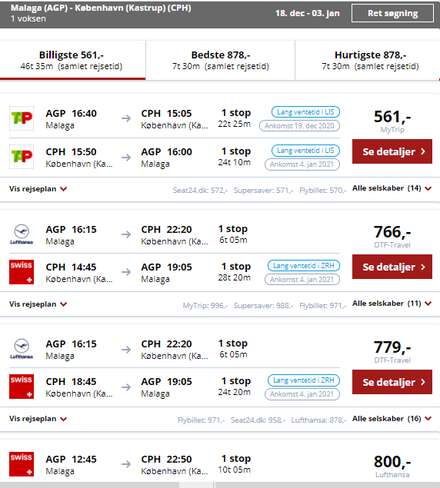 Fra Málaga til København den 18. december og retur den 3. januar