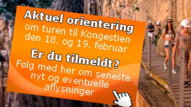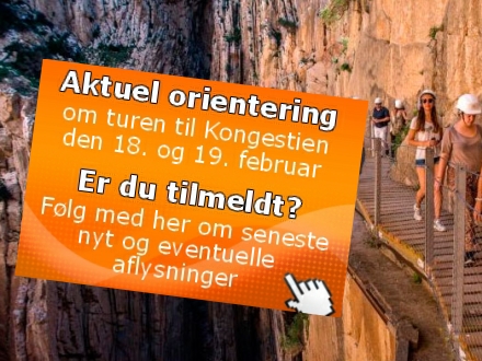 Alle deltagere på turene til Caminito del Rey torsdag den 18. og fredag den 19. februar har fået en mail med hensyn til dag, afgangstidspunkt, kort over afgangssted, vejrlink og praktiske oplysninger.