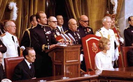 15. juni 1977: Kong Juan Carlos taler i Parlamentet. Til højre Dronning Sofia
