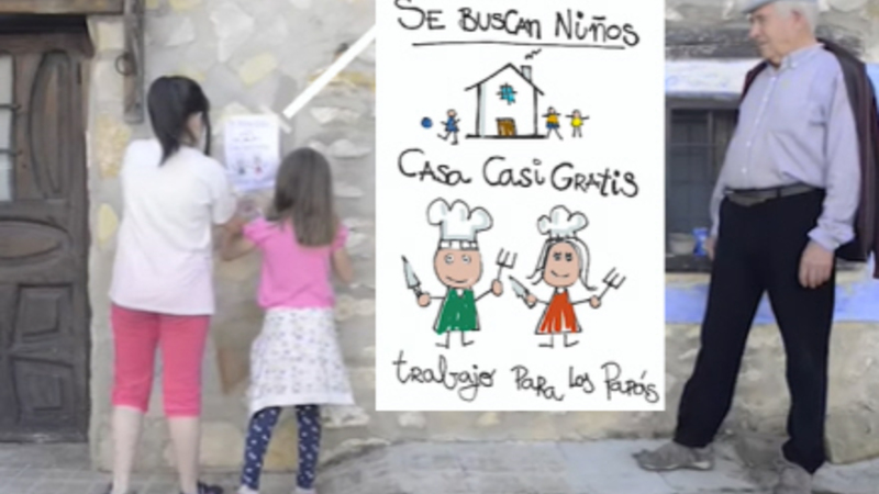 Og i en video har man lavet en lille historie ud af det, hvor to af byens skolepiger tegner budskabet om, at de leder efter børnefamilier. Tegningen bliver så scannet og kopieret af en af byens gamle mænd, og herefter så klistret op overalt i byen. Se med her: