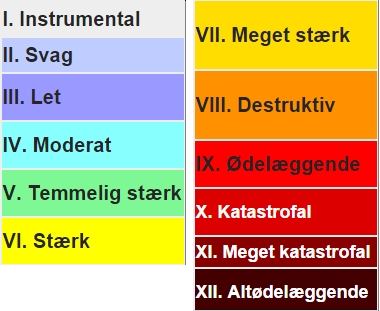 Skalaen går fra 1-12 og er baseret på den fælles europæiske skala EMS. På dansk også kaldet Mercalliskalaen