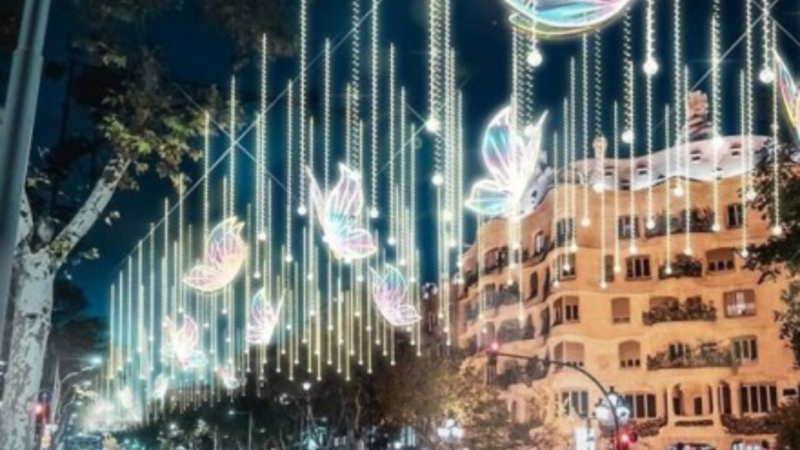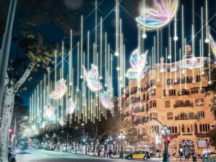 Det består af lodrette lysstrimler og 150 farverige sommerfugle, der går hele vejen langs promenaden fra Jardines de Gràcia til Plaça Catalunya.