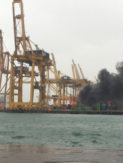 Kæmpe passagerfærge sejlede direkte ind i en kran på sydmolen i Barcelona i går, hvilket fik den til at vælte og bryde ud i flammer.