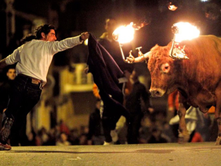 “Bou embolat” er en tradition, hvor tyre får kugler sat på hornene, som man så sætter ild til. Dramatisk at se på, og næppe synderligt behageligt for tyren.