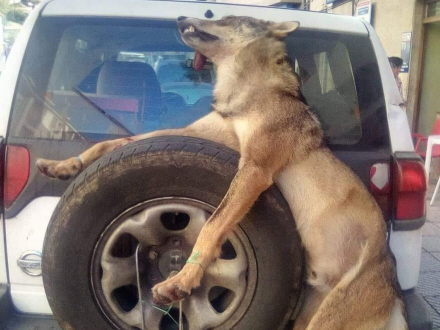 Et ulvekadaver var blevet klynget op på bagsiden af bilen til frit skue for alle forbipasserende, mens bilens ejermand slukkede tørsten på en nærliggende bar.