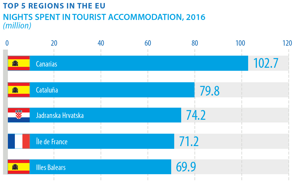 Med “kun” 70 millioner overnatninger må De Baleariske Øer imidlertid se sig fortrængt til femtepladsen, da Jadranska Hrvatska og Île de France slår dem med henholdsvis 74 og 71 millioner sovende besøgende.