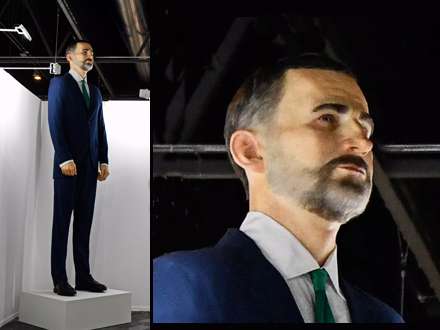 KUNST & KONGELIGE: En 4,5 meter høj skulptur af Kong Felipe VI er netop nu til salg på ARCO - messen for moderne kunst i Madrid. Men der stilles et særligt krav til køberen...