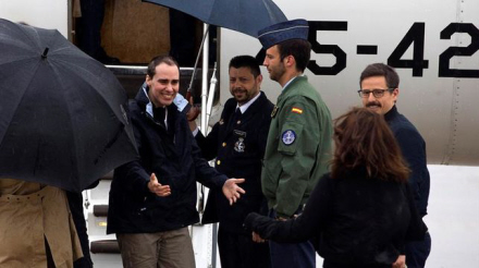 Søndag landede de tre mænd i en Falcon 900 på den militære flybase ved Torrejón de Ardoz nær Madrid.