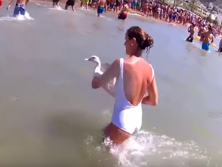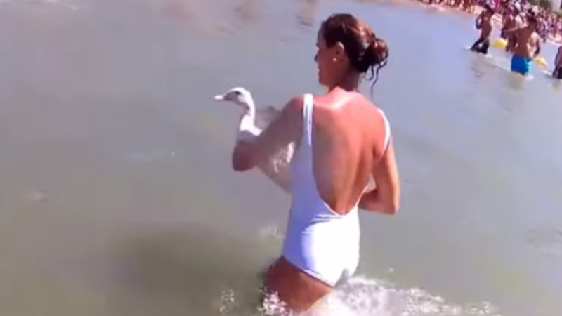 Kvinde slår aktivist med levende and