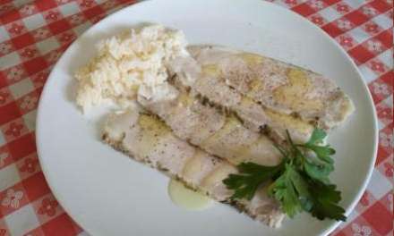 Her serveret med med ris oglidt olivenolie oven på kødet.