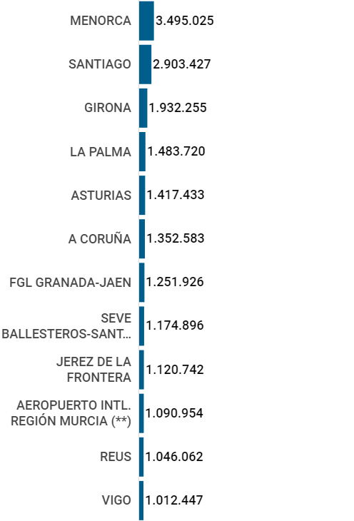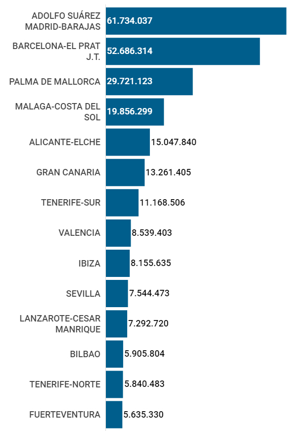Josep Tarradellas Barcelona-El Prat var nummer to med mere end 52,6 millioner, hvilket var en stigning på fem procent og endelig på tredjepladsen kom Palma de Mallorca med 29,7 millioner, hvilket var 2,2 procent flere end i 2018. Herefter Málaga med lige knap 20 millioner, som var 4,4 procent flere end året før.