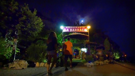 Da sulten melder sig, vender vi igen snuden mod stranden. På en tavle med farverigt kridt lokkede restauranten La Baracca tidligere med livemusik, og nu hvor klokken har passeret 21, kan vi køre hele vejen derned.