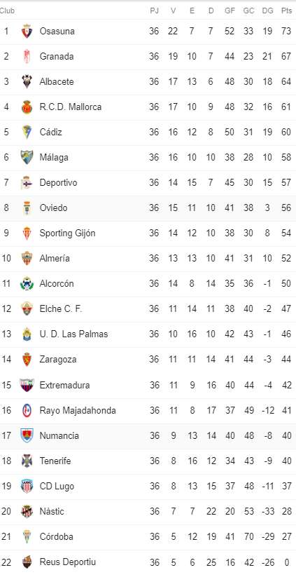 Nr. 1 og 2 rykker direkte op i La Liga – nummer 3, 4, 5 og 6 skal ud i play off kampe om den tredje oprykningsplads.