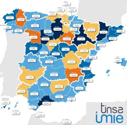 De provinser, der i årets første kvartal viste de største stigninger var Burgos med 15 procent, Zaragoza med 11,2, Valladolid med 10,8, Málaga med 10,6 og Lleida med 10,5 procent.