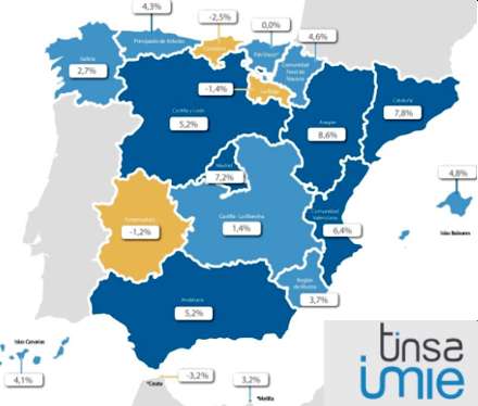 Med stigninger på 8,6 procent i Aragón, 7,8 i Catalonien og 7,2 i Madrid er de regionerne med de største stigninger i det seneste år. De efterfølges af Valencia, Andalusien og Castilla y León, hvor stigningerne ligger over 5 procent.