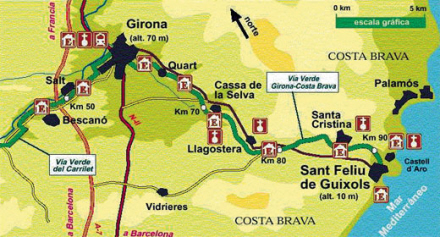 Vi hopper videre til den næste rute, der ligger i den nordøstligste del af landet: La Vía Verde de Girona strækker sig mellem Girona og Sant Feliu de Guixols. 39 kilometer sti gennem gamle Middelhavsskove og forbi kendte monumenter som Castillos-torres i Quart, Cassá, Llagostera og Santa Cristina.