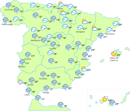 Nedbør og torden, der lokalt kan være lidt heftig i Extremadura, Andalusien og områder af den østlige tredjedel af halvøen.