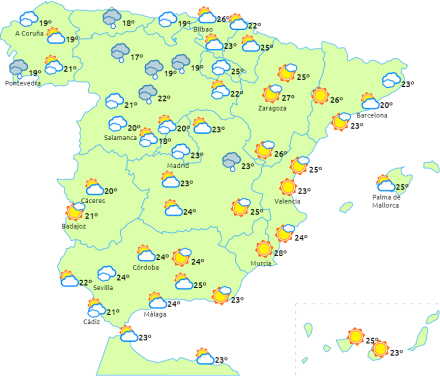 I dag begynder det at blive mere ustabilt, og der forventes skyet himmel og tiltagende uklarhed i løbet af dagen i den nordvestlige tredjedel af halvøen med regn- og tordenbyger, der lokalt kan være stærke og med hagl. Mest sandsynligt i de østlige og indre egne af Galicien, i det nordvestlige kystområde, La Rioja og Castilla y León.