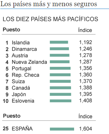 Verdens mest fredelige land er Island med et indeks på 1.192 point og på andenpladsen Danmark med 1.246 point.