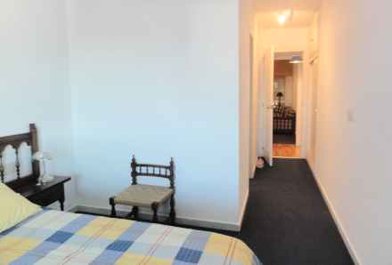View gennem master bedroom. En suite-badeværelse først på venstre hånd, efter den åbne dør mellemgang med adgang til det andet soveværelse ligefrem, gæstebadeværelse til venstre og stuen til højre. Bemærk, at der er tæpper på gulvene i værelserne