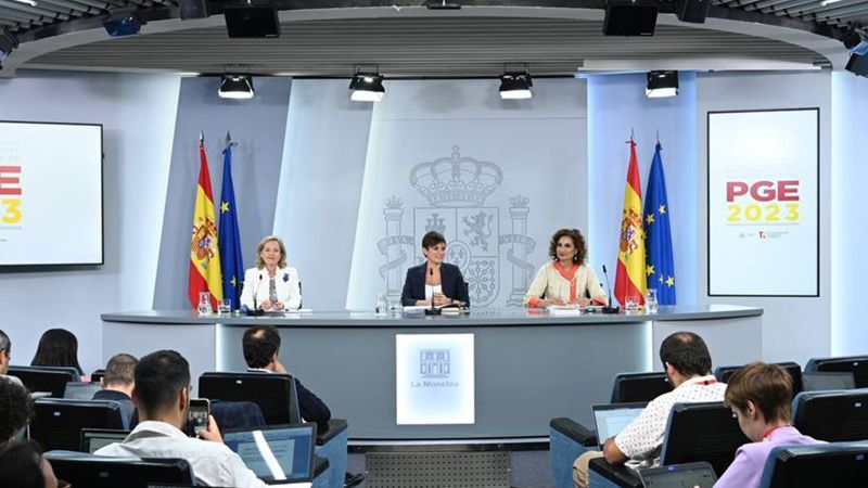 Økonomiminister Nadia Calviño, minister for regionalpolitik og regeringens talskvinde Isabel Rodríguez og skatteminister María Jesús Montero præsenterer aftalen.