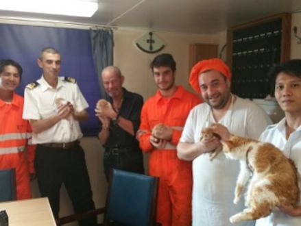 Da rejsen var overstået var besætningen blevet helt forelskede i den pelsede familie, så de indhentede tilladelse fra myndighederne i USA til at tage kattene med ind i landet.