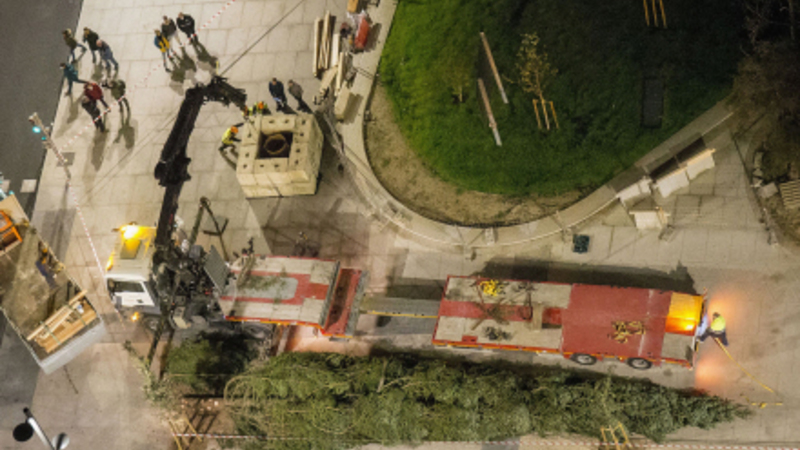 OPLEVELSE: 18 meter, halvandet ton, 200 kugler og 150 lyskæder. Som noget nyt i år får hovedstaden et gigantisk juletræ, og i morges begyndte det at dufte af jul.