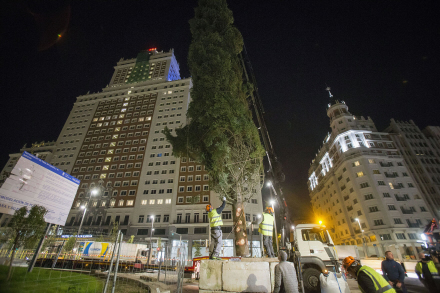 Det kæmpestore grantræ ankom til Plaza de España her til morgen, hvor det er blevet rejst i krydset mellem torvet og Gran Vía. I løbet af de næste par dage bliver det dekoreret med 800 kugler, 200 karameller og 150 lyskæder, der måler cirka 1.800 meter og har 27.000 lysdioder.
