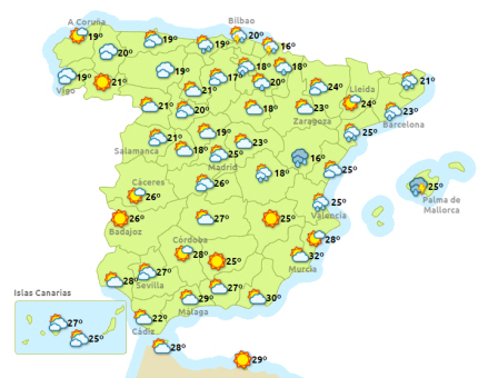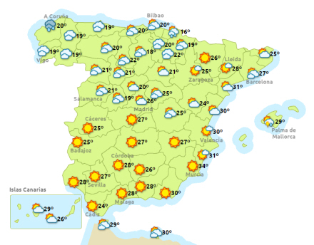Provinshovedstæder eller autonome byer med de højeste temperaturer i dag er Murcia (35), Córdoba og Málaga (34), Granada og Melilla (33), Ceuta (32), Alicante, Badajóz, Sevilla og Palma de Mallorca (31) og Huelva, Jaen, Santa Cruz de Tenerife og Toledo (30).
