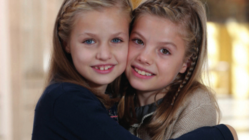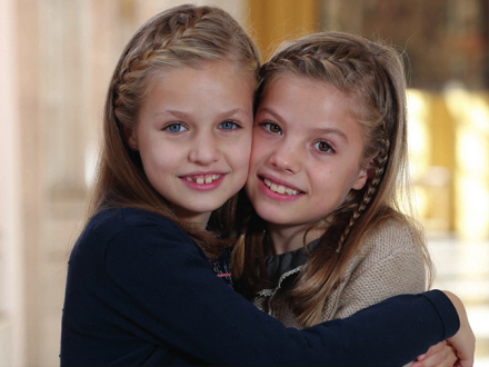 Ti-årige Leonor er den første i arvefølgen til tronen, og på billedet omfavner hun hærligt sin lillesøster Sofia, der er bare 17 måneder yngre end hende.