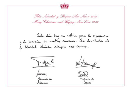 Felipe og Letizia har nemlig valgt at overlade rampelyset til de to prinsesser, Leonor og Sofia, der selv har skrevet under på julekortet.