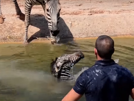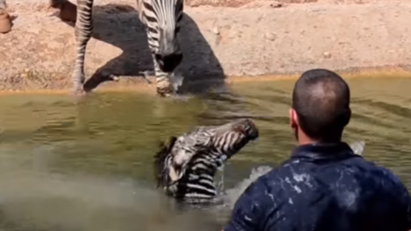 VIDEO: Lille ny zebra skvattede i vandet kort efter fødslen, men dyrepasserne var hurtigt på pletten.