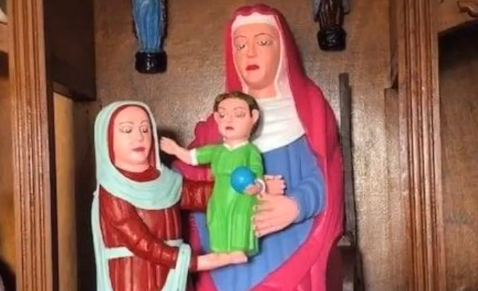 Jomfru Maria er blevet klædt i et skrigende pink hovedklæde og matchende læbestift, mens Jesusbarnets tøj har fået samme grønne farve som Kaj fra Kaj og Andrea.