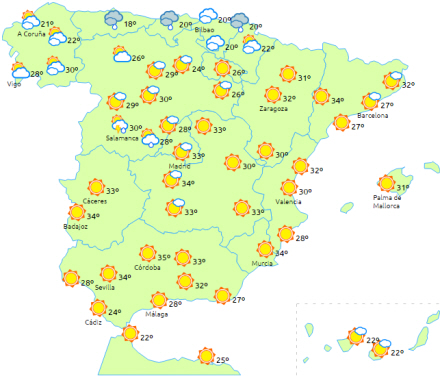 Mallorca får letskyet eller klar himmel. Temperaturerne med få ændringer, så de ligger på 28 til 32 om dagen og 18 til 20 om natten.