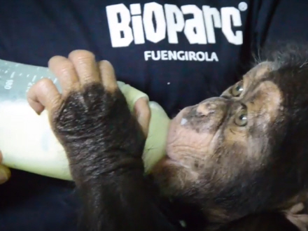 Sidste år kom chimpansen Djibril til verden, men han blev afvist af sin mor, så han blev opfostret af dyrepasserne og blev fodret med flaske og passet i døgndrift.