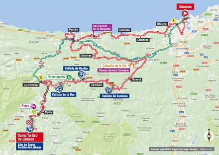 Efter starten i Suances køres der langs den smukke cantabriske kyst til Vicente de la Barquera, drejes der ind i landet , hvor der blandt andet køres langs los Picos de Europas bjergsider.