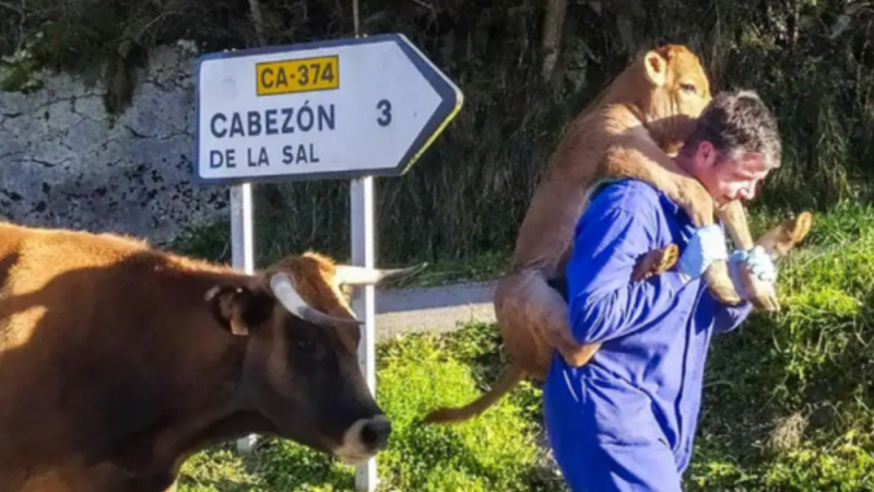Billedet af en kvægbonde, der bærer en kalv, som ikke havde kræfter til at gå helt hjem til stalden, er gået viralt.