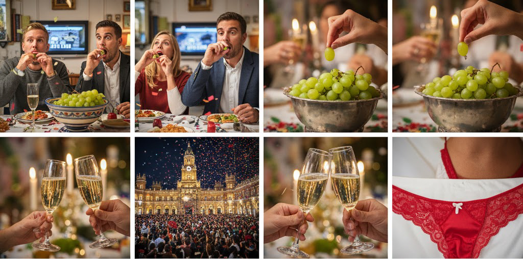 Når året skifter, og vi i Skandinavien skåler i champagne og fryser tæerne af på gaden, har spanierne et helt andet, langt mere farverigt og måske lidt mere hektisk ritual: De spiser sig til held.