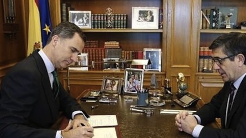 Felipe VI har i dag på sit kontor på Palacio de la Zarzuela underskrevet et dekret, der opløser parlamentet, og dermed har han udskrevet nyvalg den 26. juni. Det skete præcis klokken 9:37.