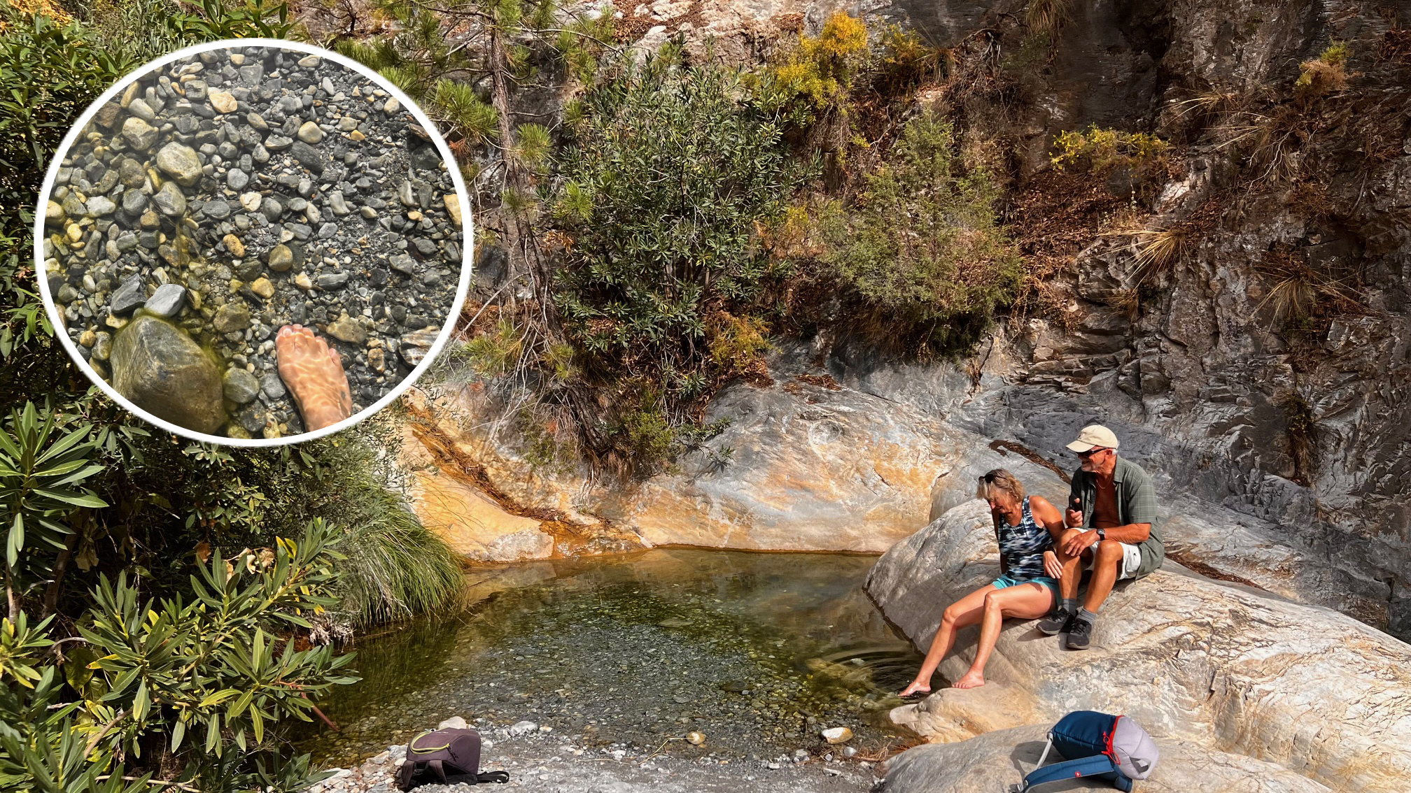Ruten fortsætter igen langs vandingskanalen, og pludselig kan vi høre mere vand end det, der risler i kanalen ved fødderne. Ruten ender ved et lille vandfald og et par naturpøler, så vi smider skoene og dypper fødderne i det iskolde og krystalklare vand - håber ikke, de bruger vandet til at drikke i landsbyen ...