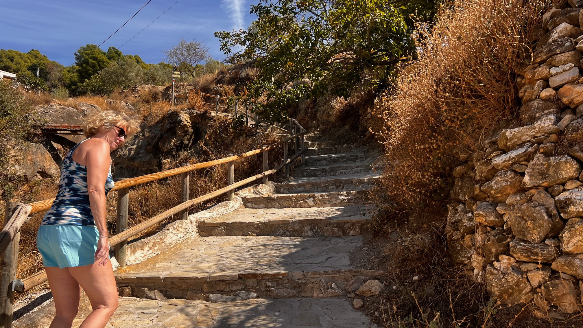 Vel ovre på den anden side skal pulsen nu op på en anden måde, da vi jo skal op igen. En håndfuld drikkepauser senere er vi oppe, og så er det, vi prøver at fortsætte videre ind i kløften. Sidste gang, jeg var der, kom vi til endnu et lille stykke med metalbur på klippevæggen, men den stoppede da hurtigt i en lukket dør og "smut lige tilbage, hvor du kom fra"-skilt.