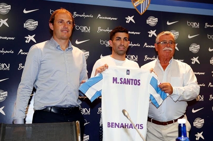 Michael Nicolás Santos Rosadilla, ny spiller fra Uruguay, flankeret af sportsdirekør Arnau (til venstre) og én af Málaga FCs rådgivere Francisco Aquilar