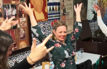 Flamenco baren gik godt. Først med solnedgang på toppen af bymuren med et glas Fino i hånden, derefter tapas og som en overraskelse kom Elena og underviste i dansen ‘Sevillanas’.