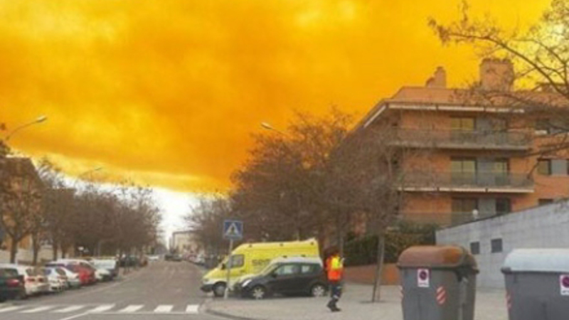 En eksplosion på en kemisk fabrik nær Barcelona dannede i går en orange giftsky, der førte til at samtlige borgere i hele området blev beordret indendørs.